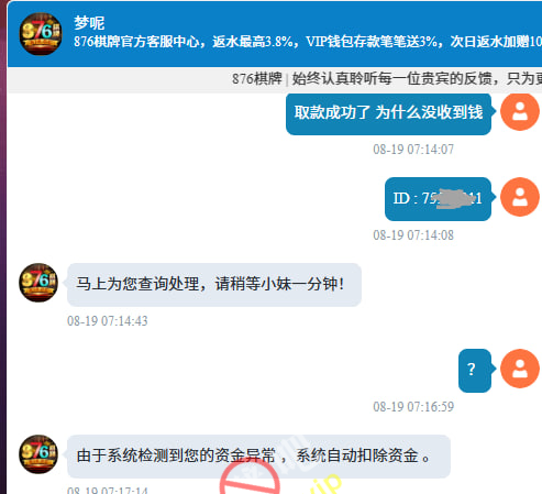 876棋牌黑台,吃相太难看了,先是充值一直和我说没到,后来联系钱包客服才给我加上了,打回来一些提现就两千多都给我黑了