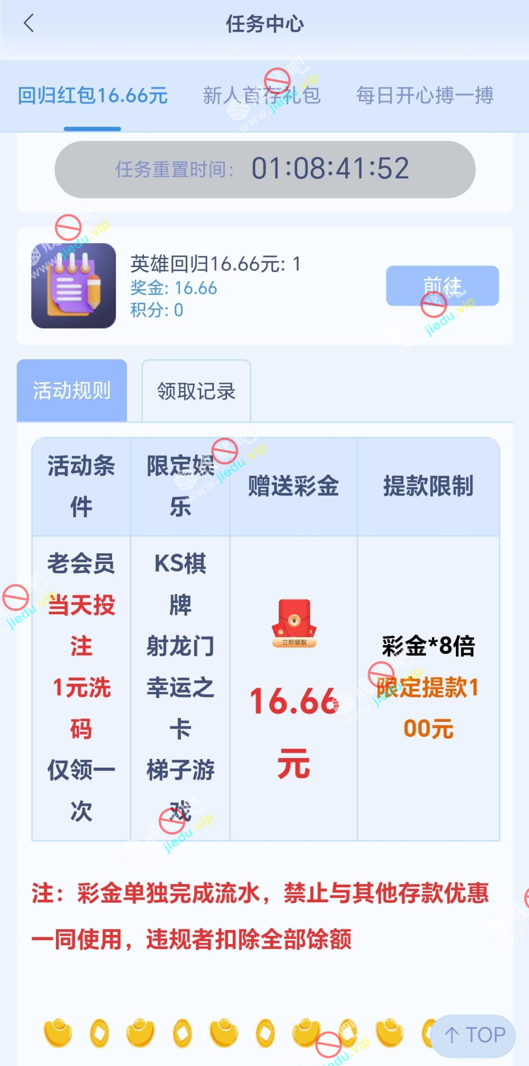 很久没登录,上去领个返水投注1块钱,能领16.66元,有帐号还没领返水的可以上去领一下。
