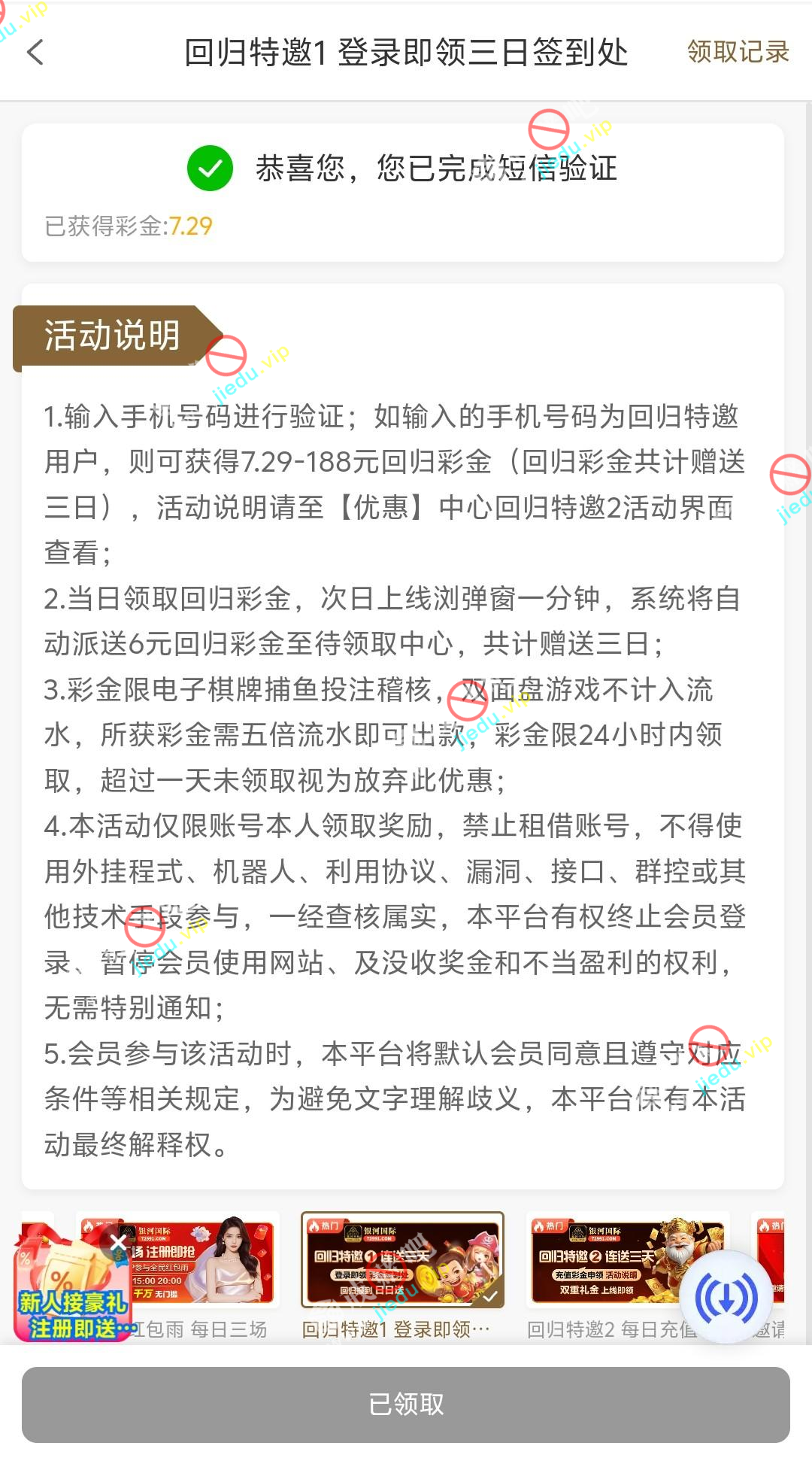银河72991回归送3天没充值过,之前这个应该都有特邀,没注册的去碰特邀,注册过得去领回归连送3天打出评论一下老哥们。