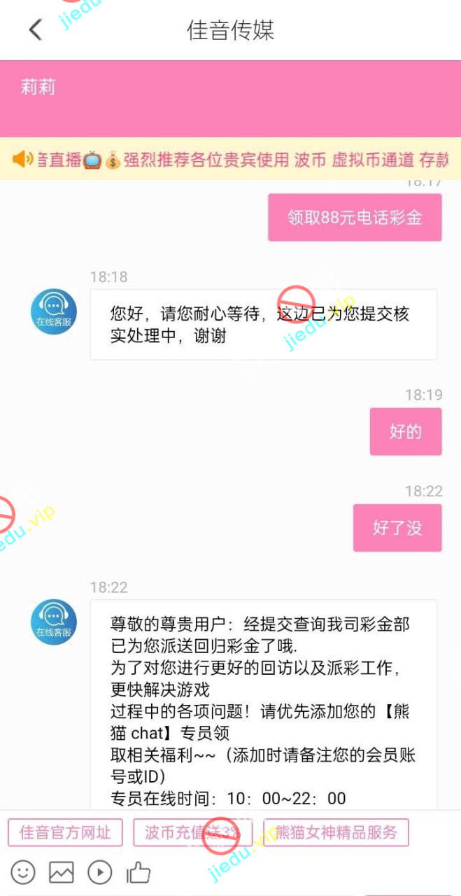佳音直播电话彩金88元,无限制,一杯水提现