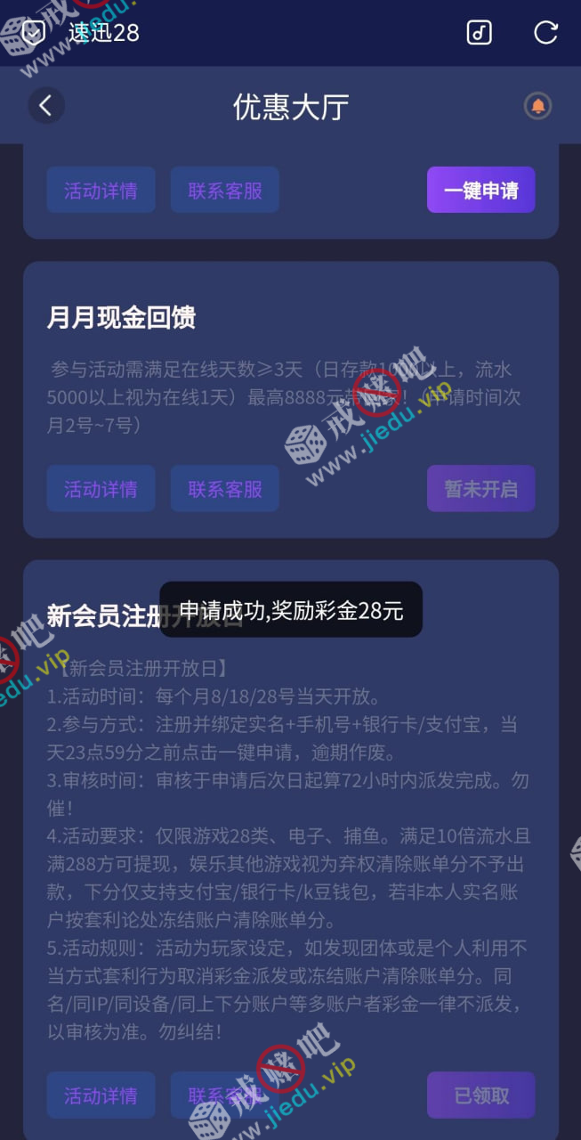 每月8~18号~28号。注册的新用户即可申请28,绑定基本信息,在优惠中心一键申请,审核会比较久这个
