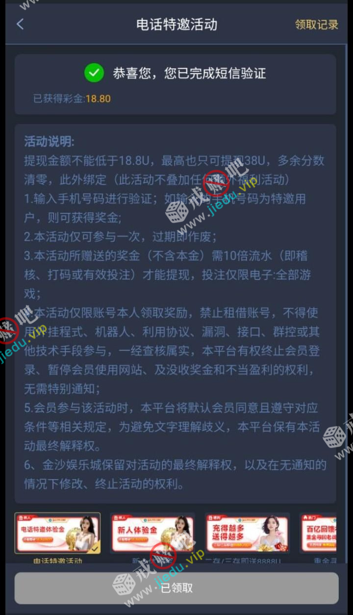 我是接到的电话,短信验证通过直接到账18.8u,哥们可以去碰碰瓷瓷!