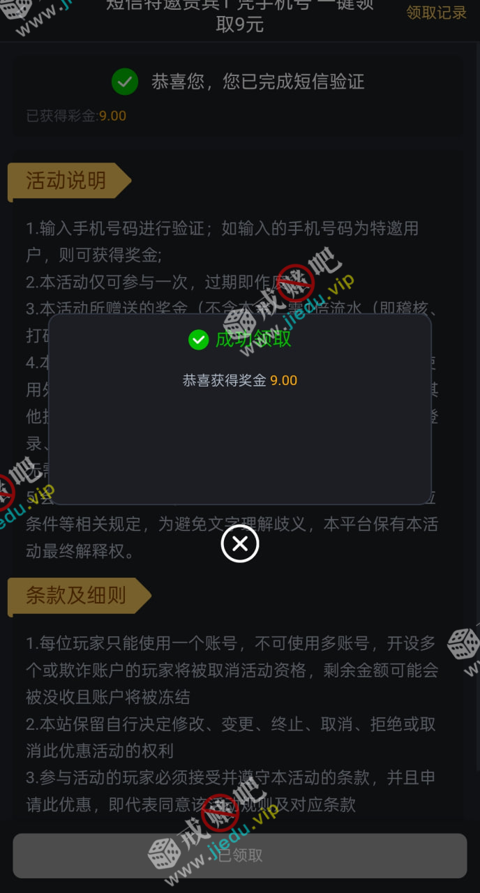 验证短信自助领取9,还没拿到的朋友们去拿。