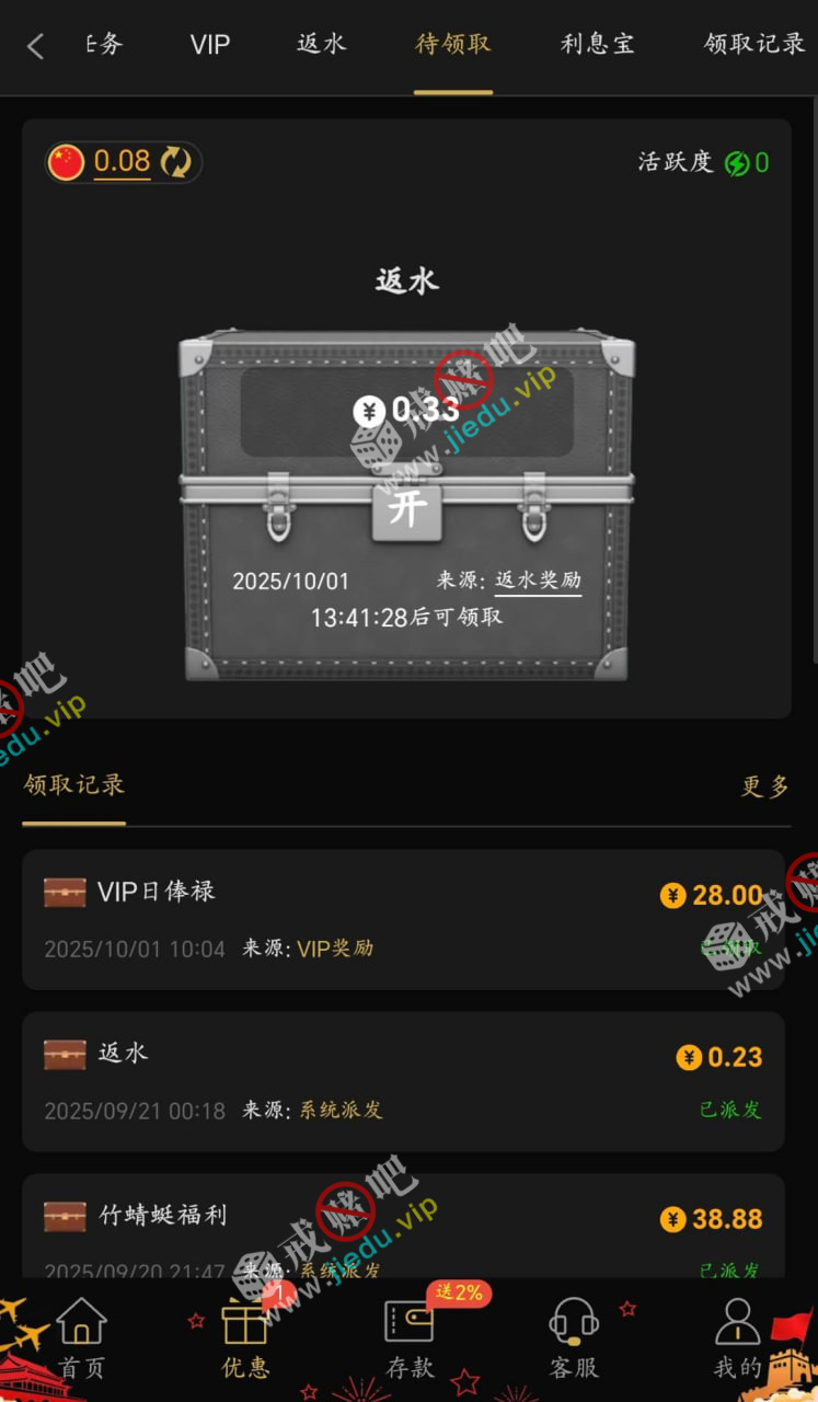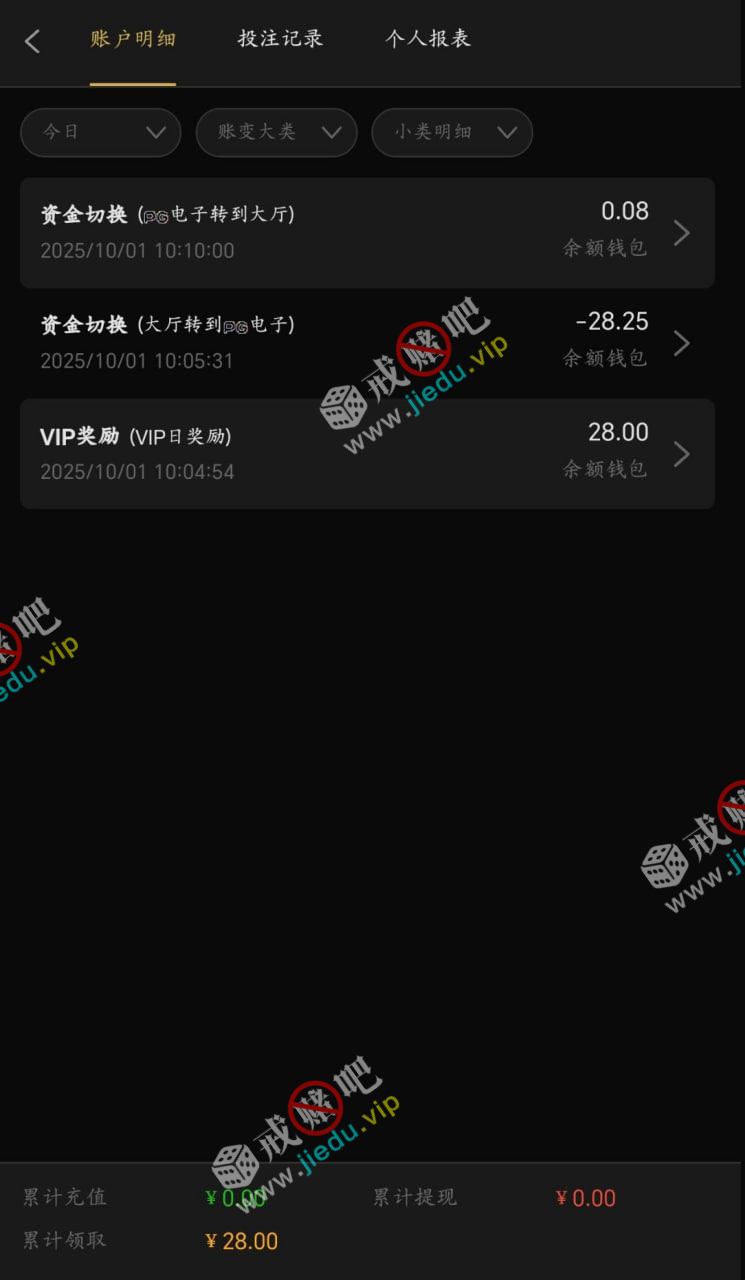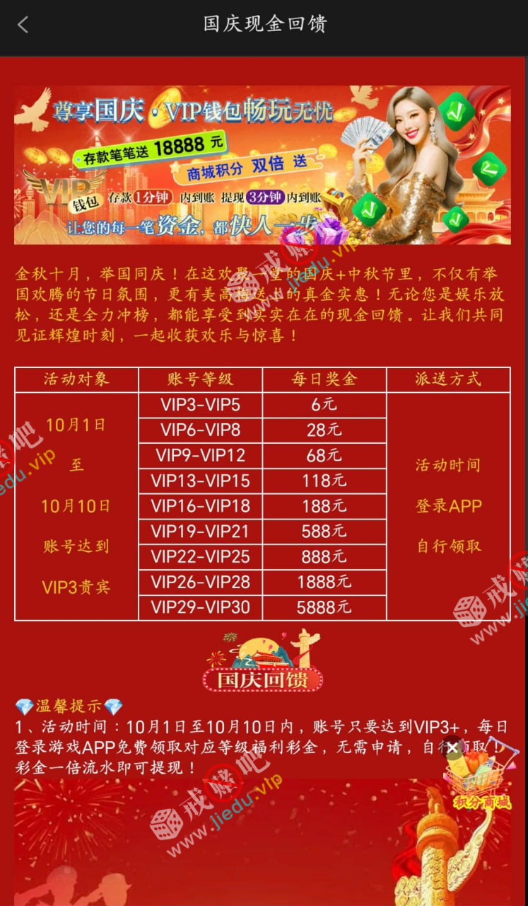 都去看看吧,我当时是一注册就VIP6,现在VIP7了,国庆这10天每天都能领28,没什么限制,一倍流水就行 。
