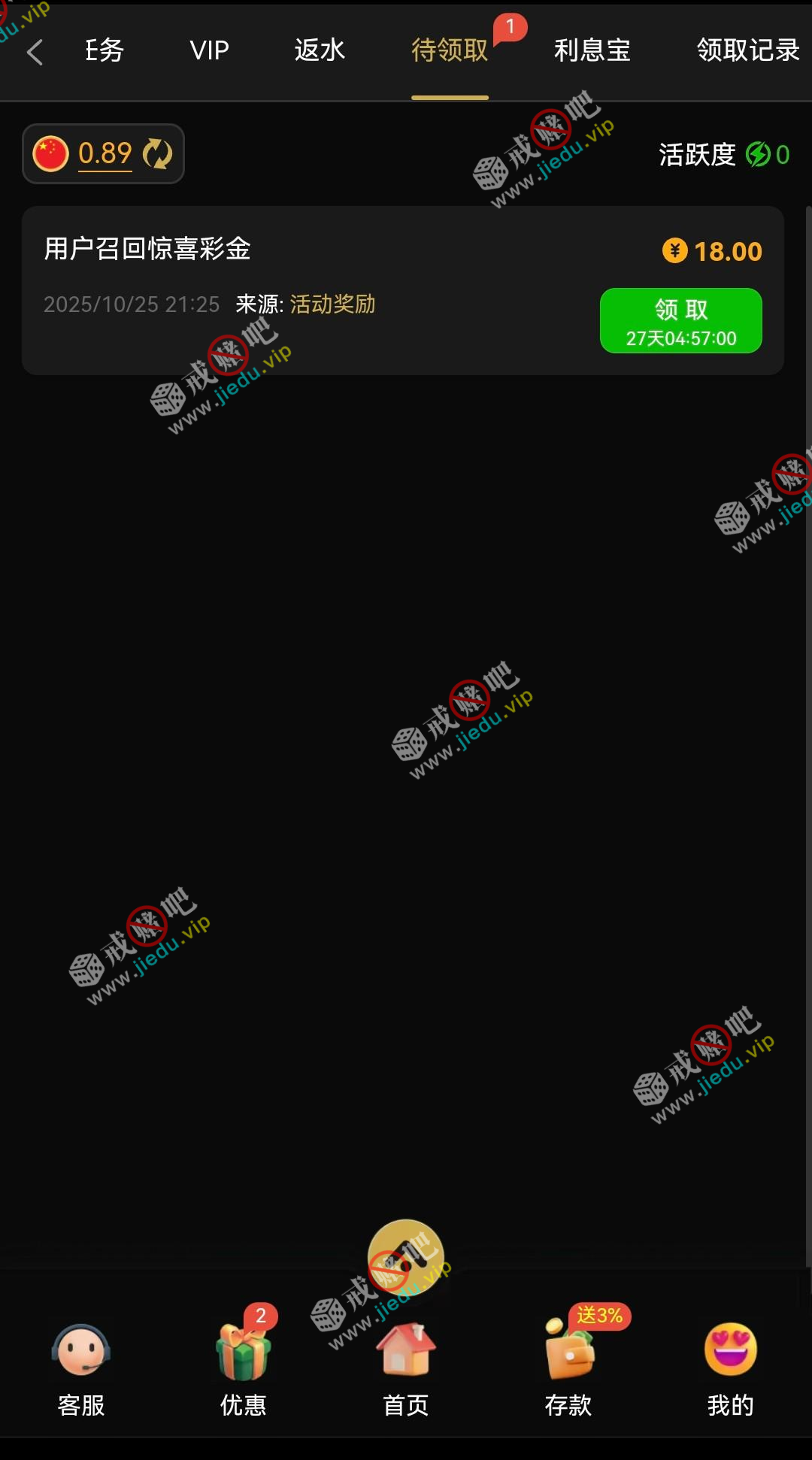 用户召回彩金有号的老哥可以看一下,我也是今天上号才看见的,在待领取里。